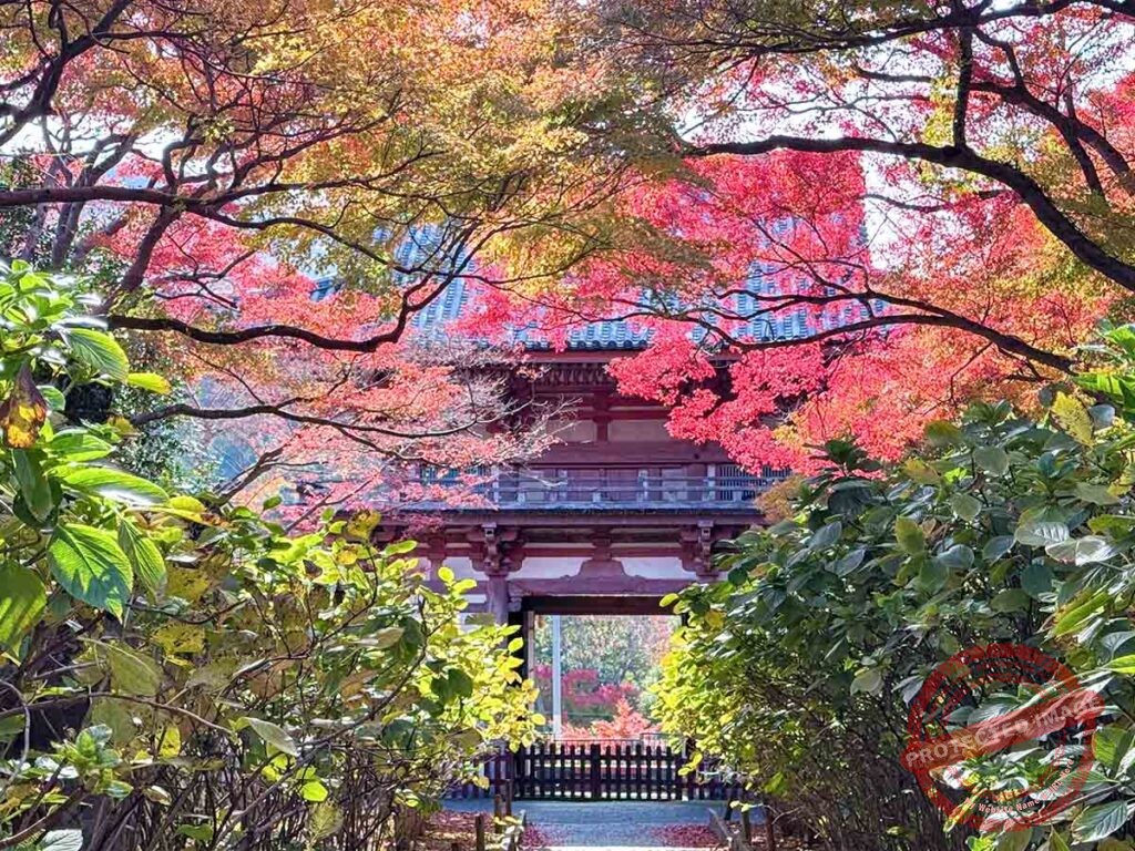 The visit begins at a monumental National Treasure gate, an exceptional example of Muromachi-period timber architecture. In late fall, the gate’s weathered dark wood creates a dramatic counterpoint to the vivid maples that frame the entrance. Beyond, the grounds unfold as a layered landscape of terraced gardens and ancient stone paths. Here, kouyou (fall foliage) is viewed against deep green moss and 10th-century stone carvings, producing a visual contrast that feels akin to a living museum.