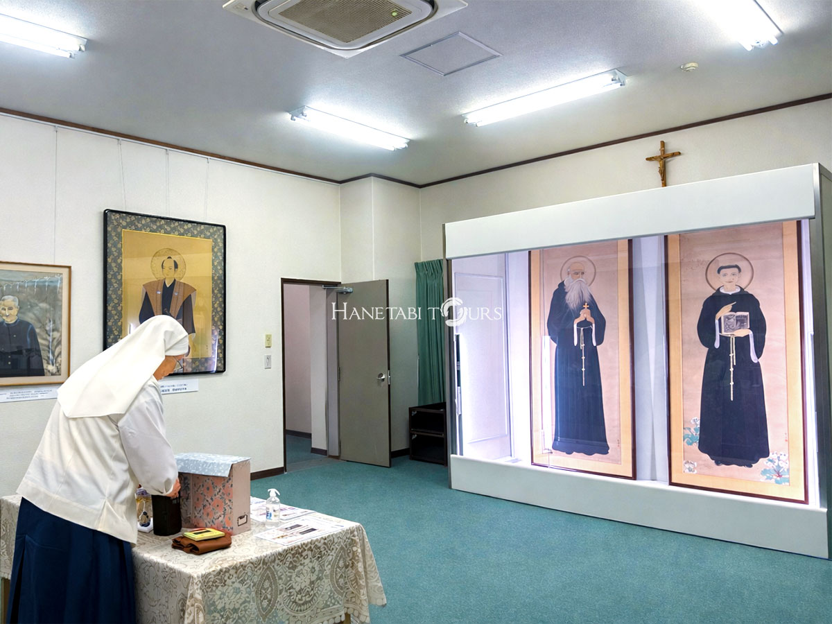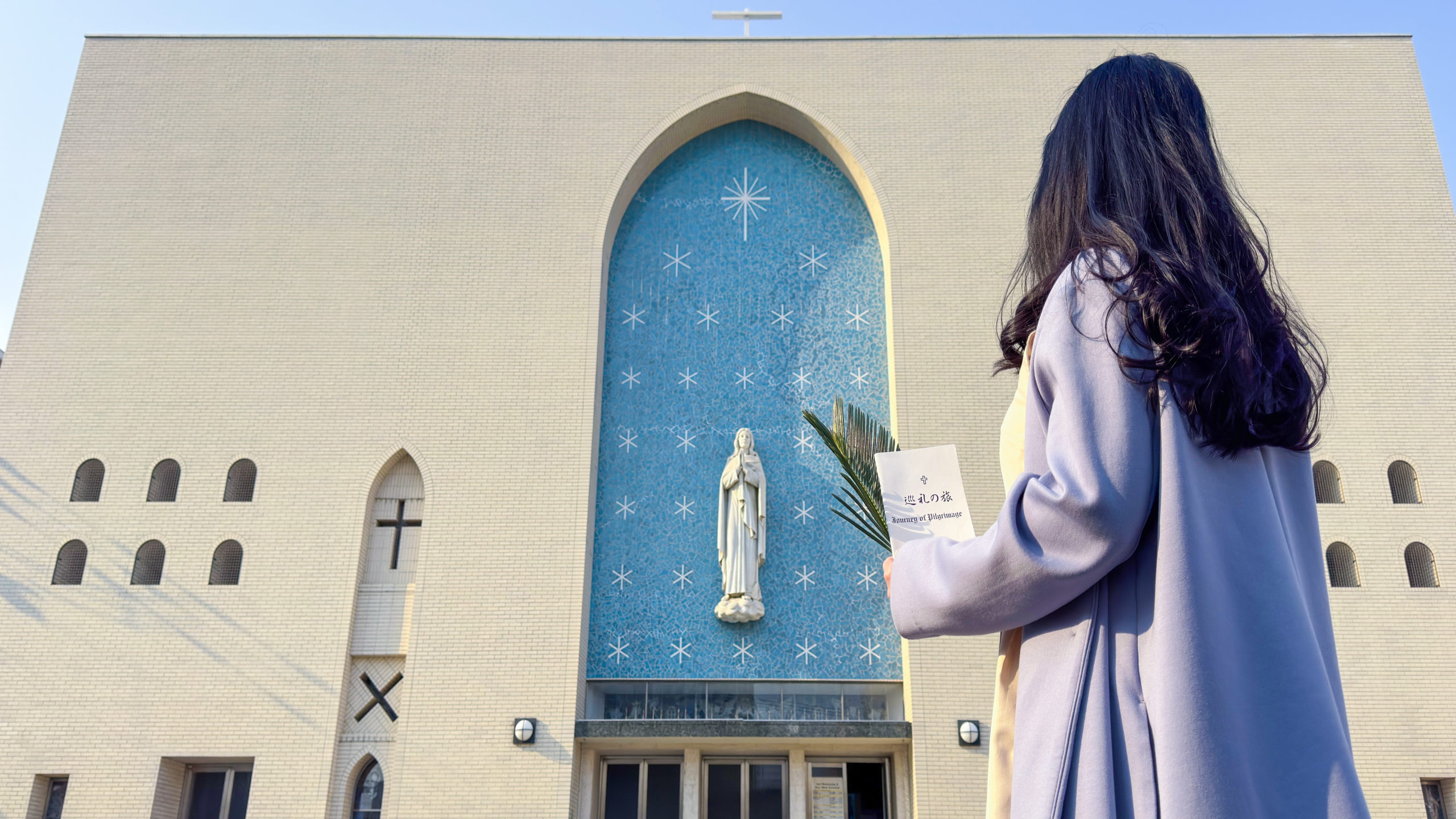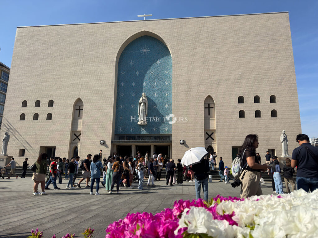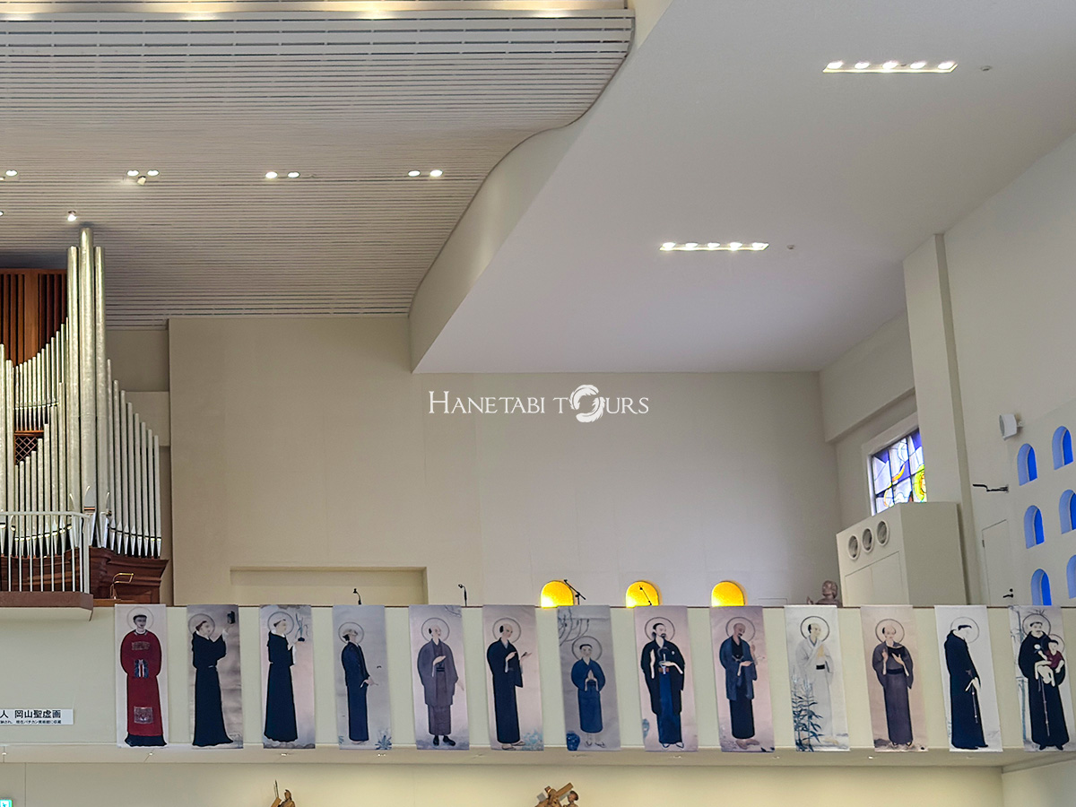 The cathedral’s cream-tiled exterior is punctuated by a striking sky-blue mosaic. Here, a breathtaking mural by the renowned Japanese painter Insho Domoto depicts the Virgin Mary and Child alongside two pivotal figures: the samurai lord Blessed Justo Takayama Ukon and the noblewoman Hosokawa Gracia.