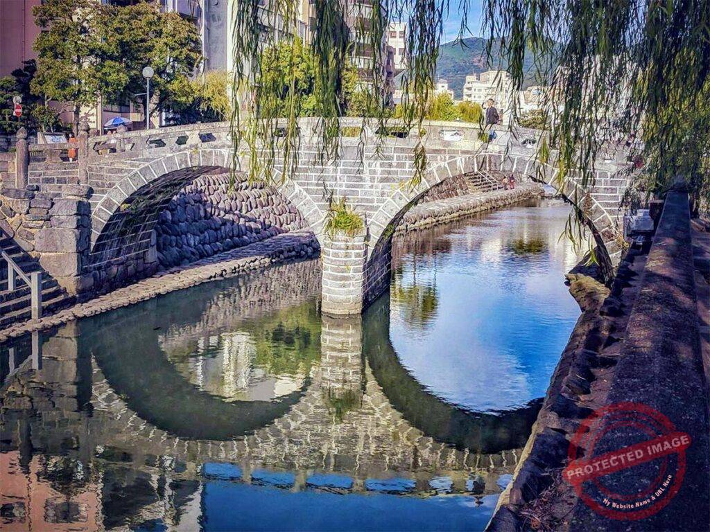 Spanning the Nakashima River, the bridge was constructed in 1634 by the Chinese monk Mokusyo Nyojo, the second-generation abbot of Kofukuji Temple. The bridge is architecturally defined by its two symmetrical stone arches which, when reflected in the tranquil waters of the river, create the distinct visual illusion of a pair of spectacles. This design reflects a sophisticated level of stonemasonry introduced from China during the early Edo period. The construction utilizes meticulously carved basalt and stone blocks, fitted with a precision that has allowed the bridge to survive numerous floods and urban developments for nearly four centuries.